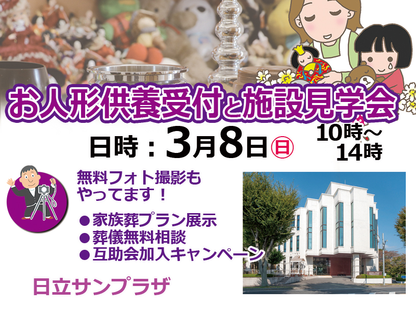2026年3月8日(日)10時~14時 にセレモニア富士日立サンプラザで「お人形供養受付&施設見学会」を開催いたします。…