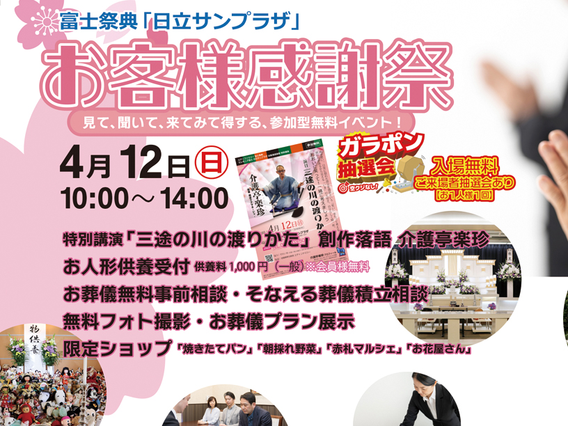 日立サンプラザでは、4月12日に「春のお客様感謝祭」と題し施設見学会やお葬儀事前相談会を開催します。今回は特別企画として…